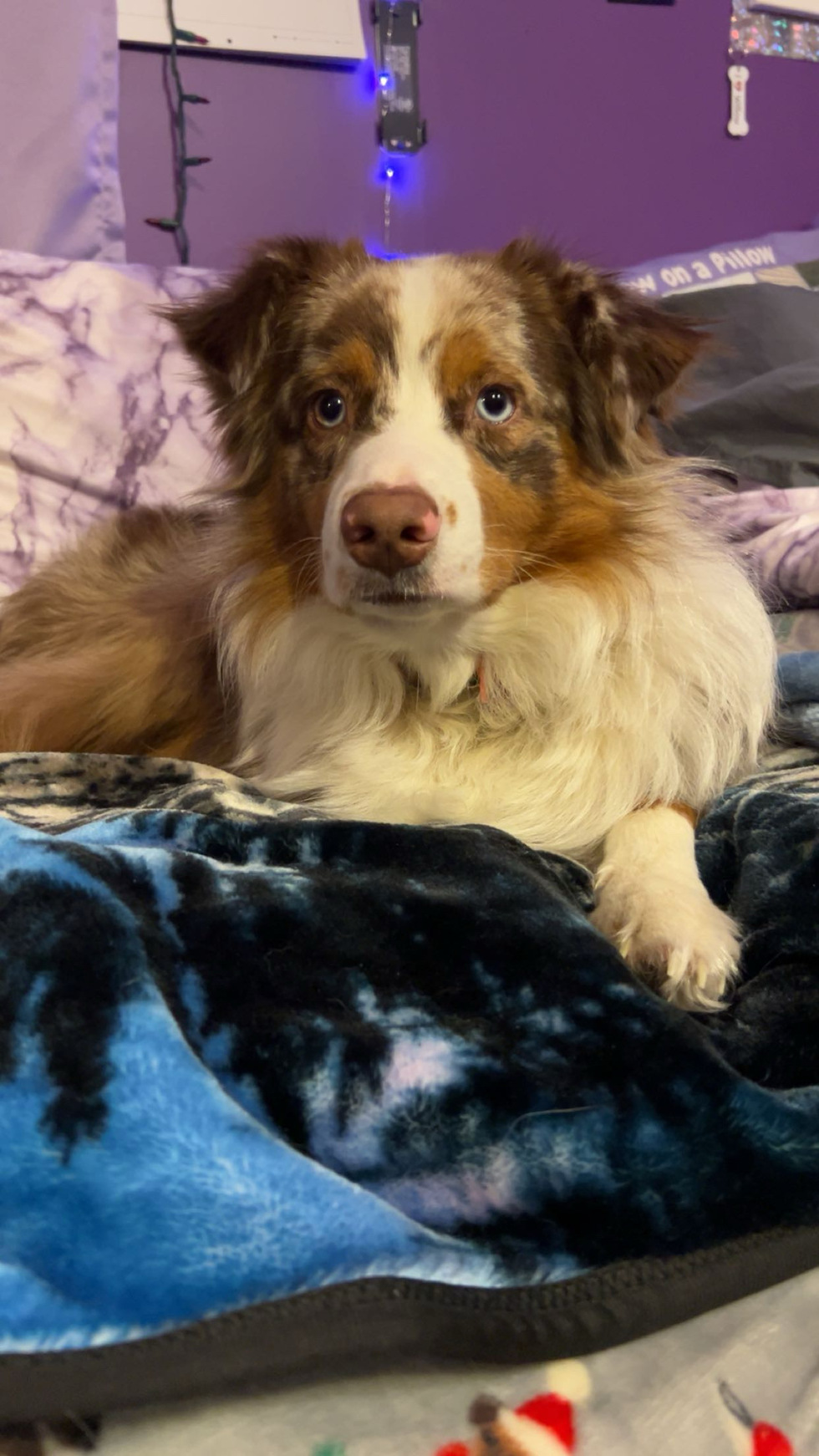 This is Willow! She is an Australian shepherd, she is 3 years old and loves the attention. She is very sassy but she gets it from her owner!