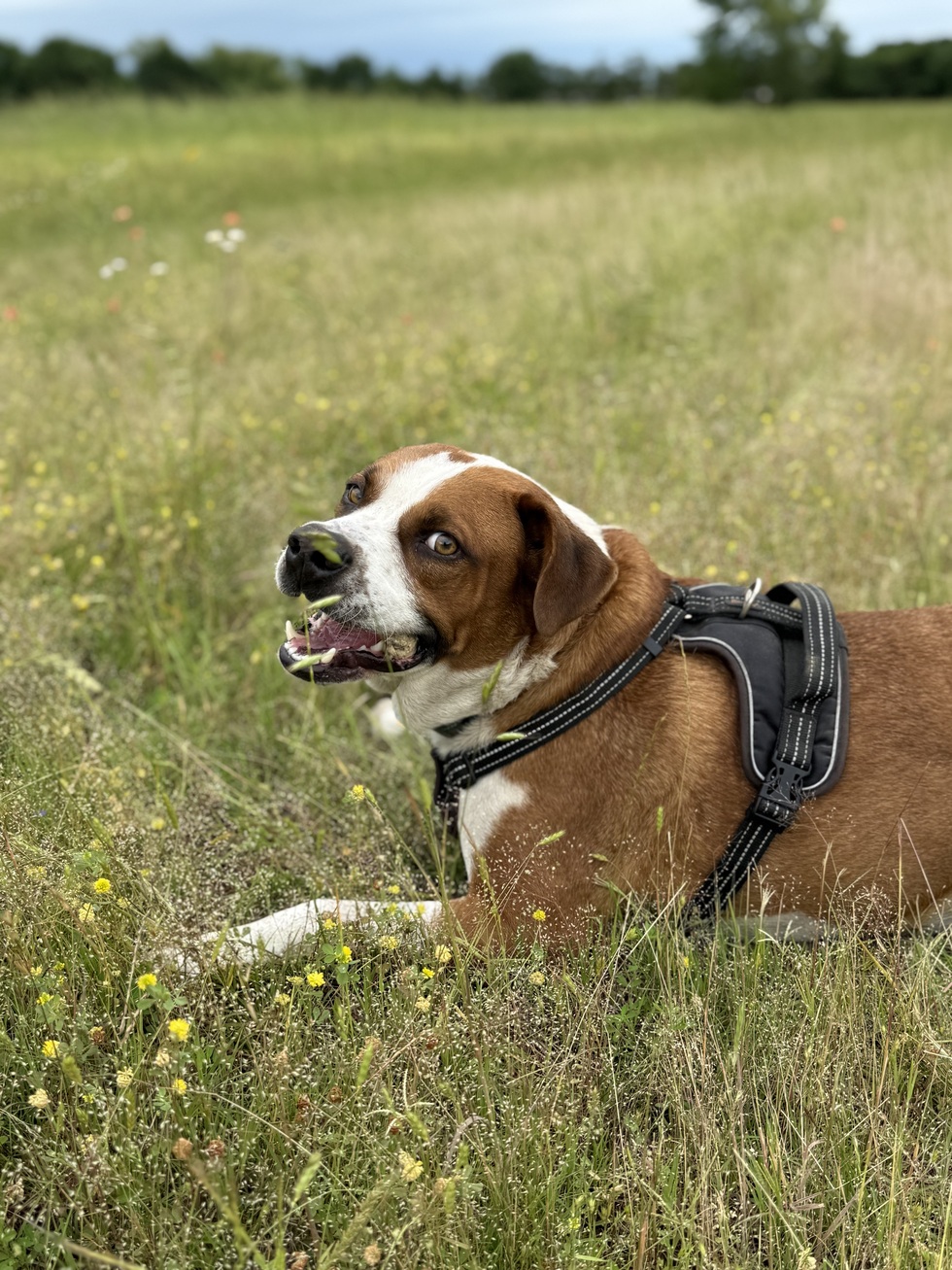 My name is Simba, but my momma calls me Simba Bimba. She says that I am a very good boy, and she takes me running in the pastures almost every day! But my real responsibility is guarding the Sequoyah Animal Advocates Wellness center when I'm not playing with my Mom.
