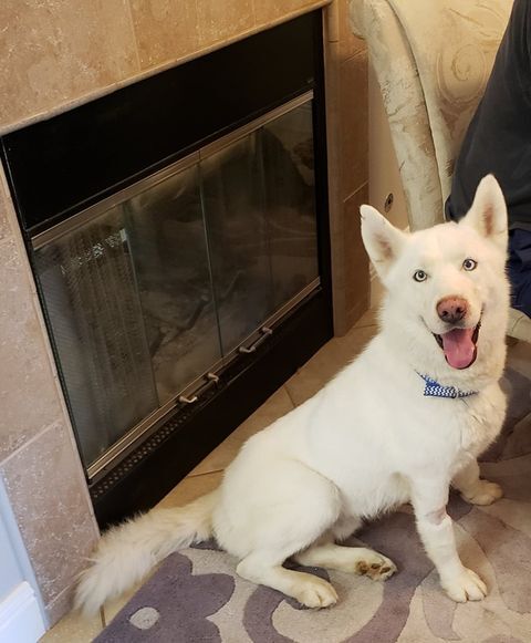 My wife and I took Koda Bear in to foster after Shadow Husky Rescue asked for help and he needed a place fast. He was picked up on the side of the road by a Vet Tech was driving buy and saw him scared as someone was throwing rocks at him. When he arrived it was hard to believe someone could be so cruel to this dog that immediately seemed to love everyone around him. He is gentle and very affectionate and always has a smile on his face, didn't take long to realize he ended up with us for a reason and as of yesterday made it official and adopted him, Koda is our second rescue we have taken in, our first was Diamond. I love this photo. It was his first day at our home. He was so happy!