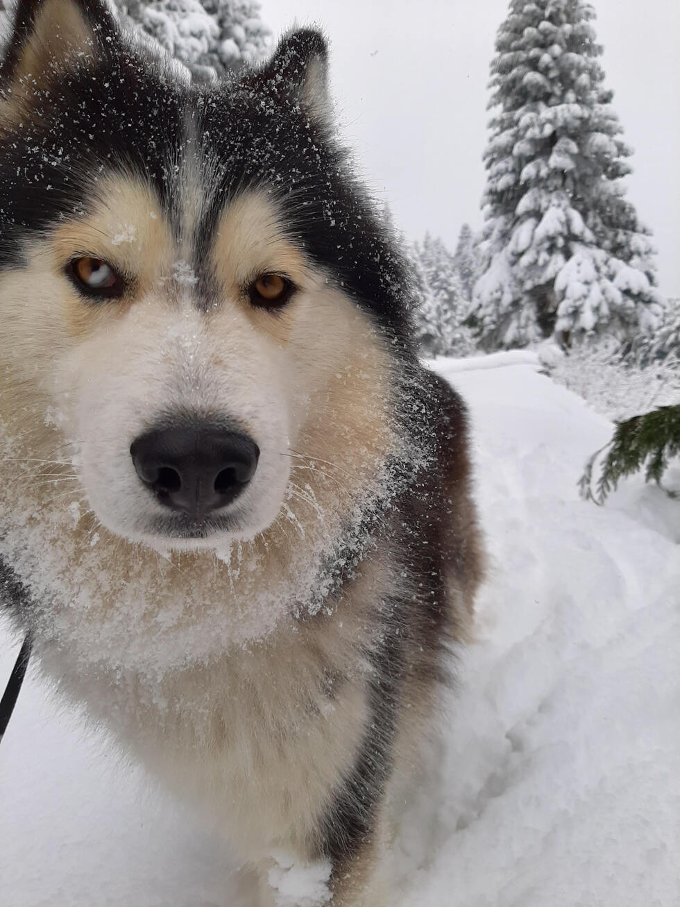 I found Shadow (formerly Bazzi) online at the Carson Animal Shelter. Shadow came in as a stray. He was labeled as "rescue only" for 2 months with code red down to his last days. I was not ready for a dog as my Samoyed just passed, but I could not believe nobody was going to rescue him so I submitted my application as an inquiry and Shadow Rescue contacted me that they would rescue him if I fostered which I was happy to do. About a few weeks later; I found out he had giardia, pneumonia, and some ticks! I could not imagine him going to another owner with the risk of ending up at the pound! I officially adopted Shadow and he has been living a loving happy life with our family. He is about 3 years old now. He is extremely smart! He wakes me up at 6:30 AM howling at me (my alarm clock goes off around this time), can run 25-30 MPH towing a skateboard and absolutely loves being in the water and snow! He is a picky eater and enjoys eating meat. His current favorite toys are the hose, watering can, and a trash can lid!