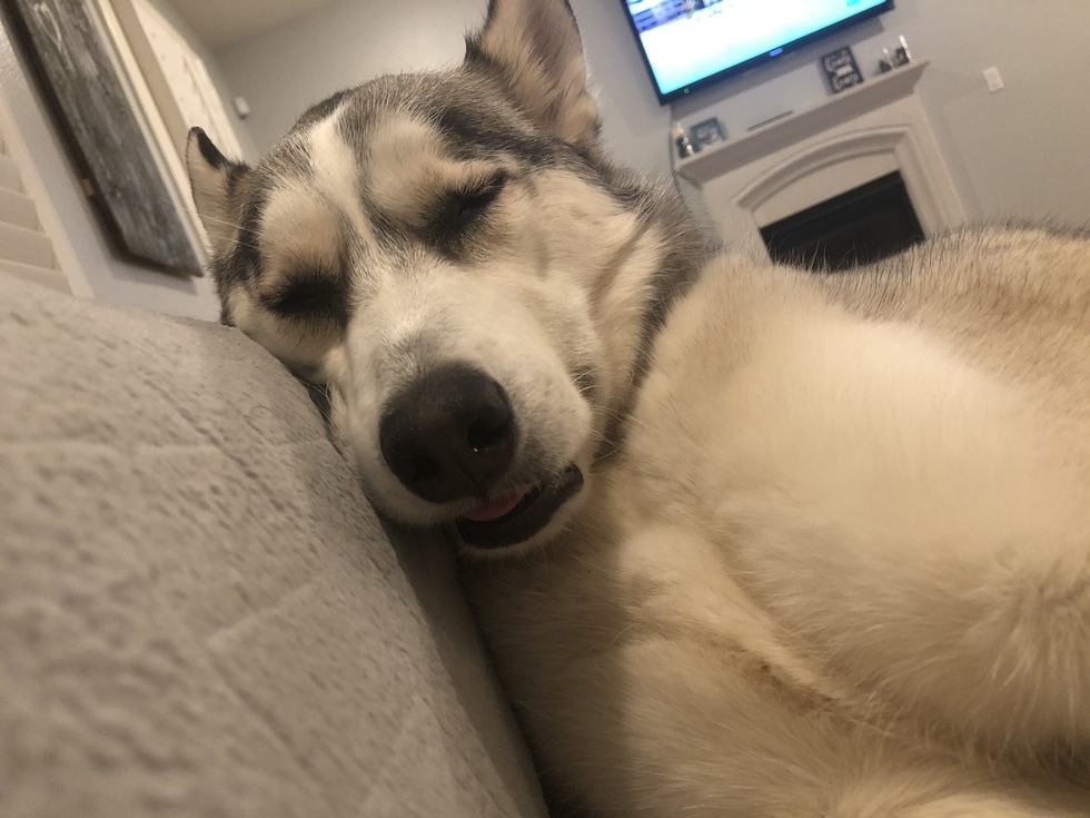 Meet Sasha! AKA Sasha Bear! This is the 2nd fur baby in our Husky pack and such a cuddly bear! We adopted her to give our first Husky a friend and quickly learned that she just wanted to be loved and cuddled! She’s quite the protector and best friend to our grandson. She also likes to hop around on things like a bunny!