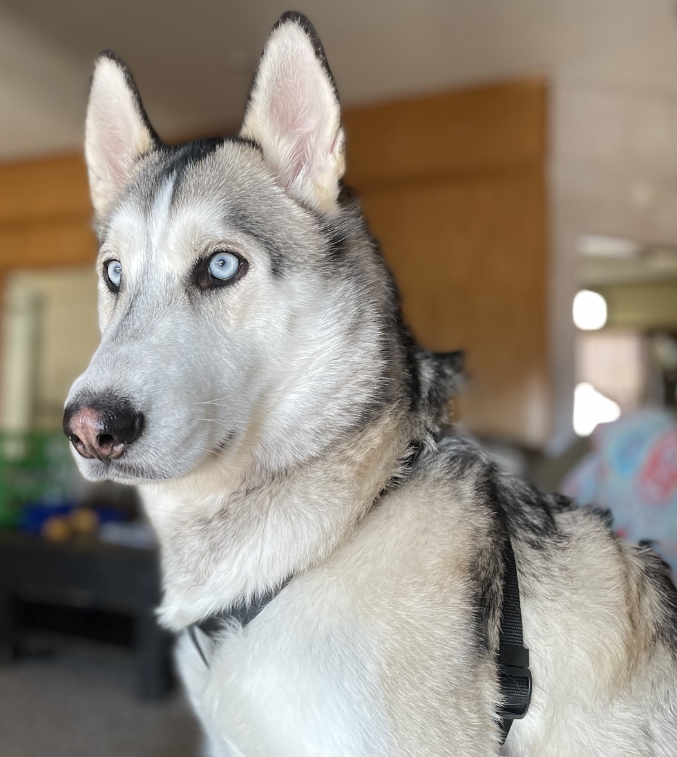 Our Dozer! Such a darling and loving boy! He really stands out and loves to run in our big backyard and to go for walks. He is our 1st Shadow Husky…definitely not the last!