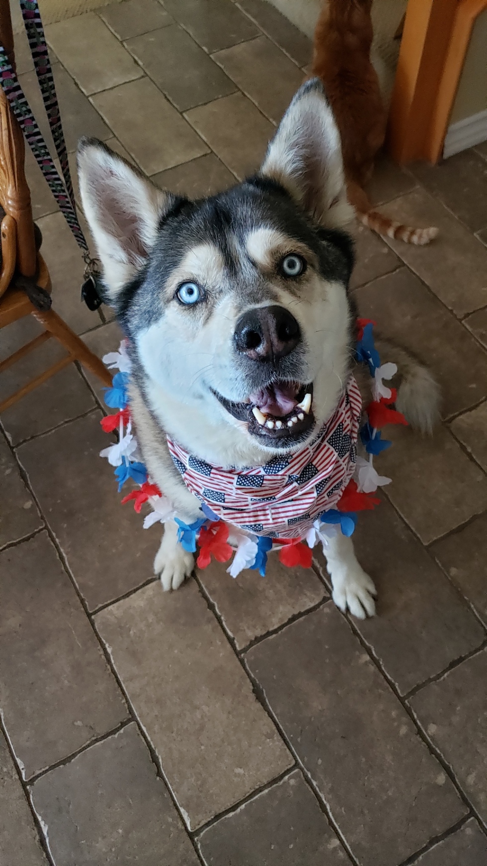 Balto is a rescue from San Diego. He joined our family for years ago. Compassionate, protective friendly and fun. He resides in the house with three cats. His least favorite holiday is Fourth of July!! But I was able to catch this picture of him smiling on that day!!