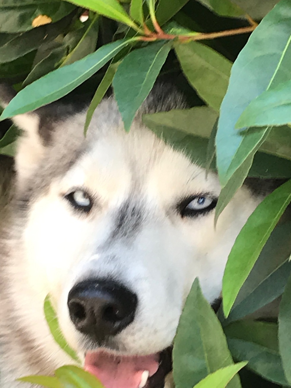 At age three, Emily's 'prey drive' exiled her to a rescue group. Once we brought her home, it took a short time for her to get comfortable in her new home. Now her favorite place to be is in the middle of our bed with the overhead fan on--and getting a belly rub! And she loves to hide in the yard--which she is doing the photo.