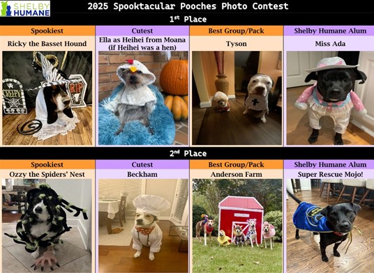 The 4 Categories for the Contest are: (1) Spookiest; (2) Cutest; (3) Best Group/Pack; and (4) Shelby Humane Alum.