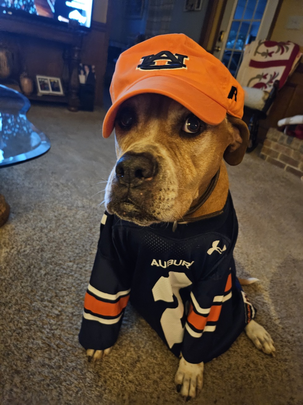 Add a short description of your photo or about your pet.I adopted Georgia in 2017 after my sweet Debo (14 years old) passed away. I was specifically looking for a dog that had been overlooked time and again. She spent 5 months at Shelby Humane waiting for someone to choose her. Thank goodness SH never gave up on her. She is my football watching buddy and of course we pull for the Auburn Tigers. Georgia is truly one of the best dogs I have ever had the privilege of loving. She loves everyone and everyone loves her.