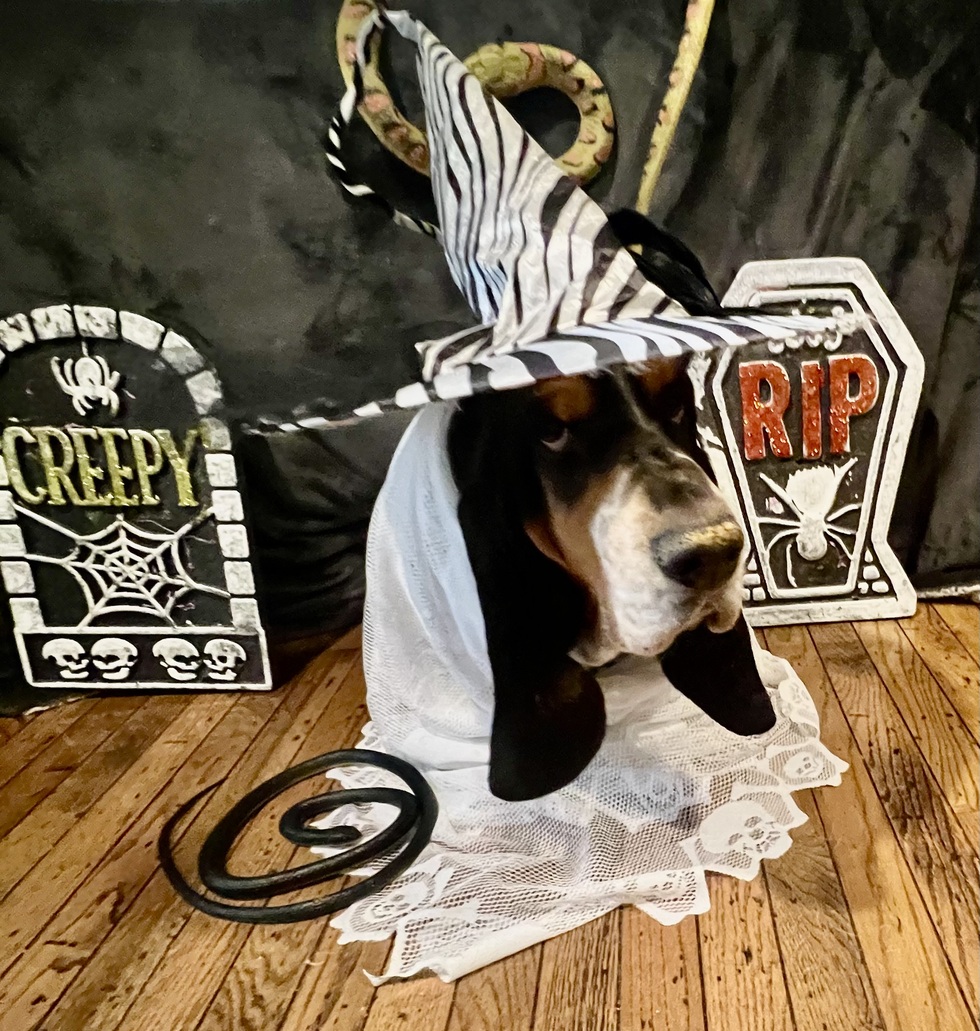 Add a short description of your photo or about your pet.Ricky the Basset Hound is ready for Halloween and is hoping for lots of yummy treats. He is nine years old and his hobbies are naps, begging for treats, and going on walks. He is a very sweet boy.