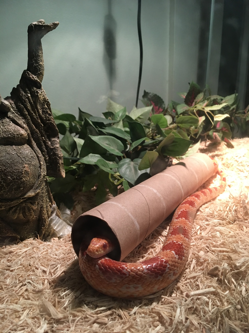Ricola is an albino corn snake & we had 13 years together until her passing. She loved to be on the couch next to me under a blanket or around my shoulders and was a huge fan of burrowing. One day she snuck into my mom’s purse while she was visiting, a perfect example of her enthusiasm for exploring.