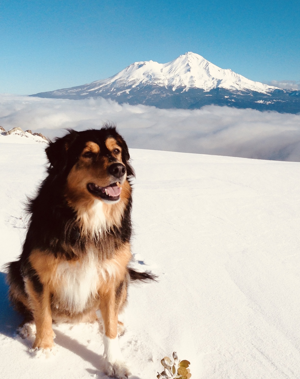 Lulu is a 4 year old Lab/Aussie Shepard Mix. Winter time is her favorite and she loves to play in the snow. Lulu is originally from Canada, so this makes sense! While traveling back to Mt. Shasta from living in Alaska for three years, Lulu’s human mom saw a flyer for puppies at a gas station and decided to “just go take a look”. The rest is history. Lulu loves to cuddle, play fetch and go on outdoor adventures. When the snow conditions permit, Lulu gets to go on backcountry ski adventures with her family. This photo is of a ski trip Lulu was on at Castle Lake.