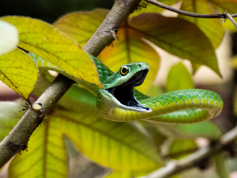 This African Green Bush Snake (Philothamnus irregularis) was found in Guinea, West Africa. The Green Bush Snake is not venomous and spends much of its time in trees, where it hunts small lizards, frogs, and insects. Although it is harmless to humans, it is easily mistaken for the venomous Green Mamba which shares similar vivid coloration, speed, and habitat.