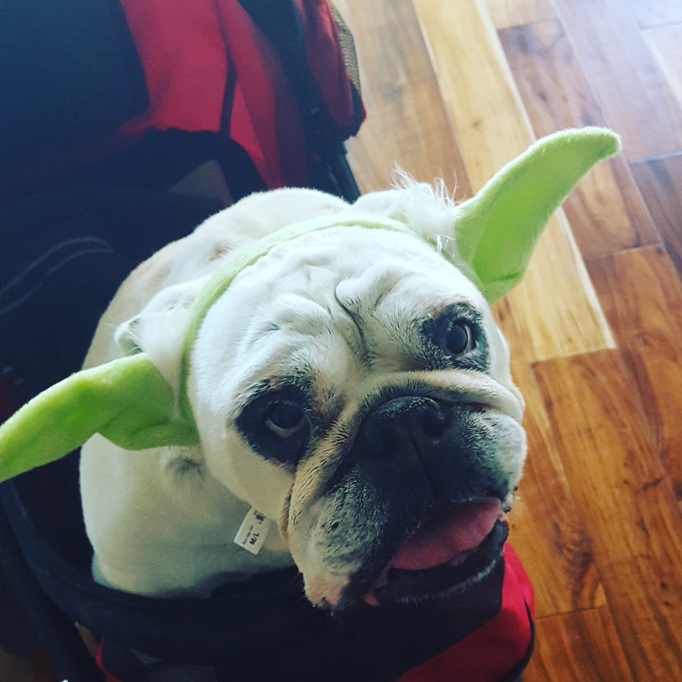 11-years young, Pumbaa rescued us. Here she is preparing for her first costume change for ComiCon this summer, as Yoda. She went as Capt. Kirk and Princess Leia as well this year! Her costumes still fit - they are from her days as a Pet Partner Therapy team with her humans. (Ok the Elvis jumpsuit is a bit snug; it happens!) She enjoys eating, sleeping, and crowding personal space. Thank you SCBR for all you do!