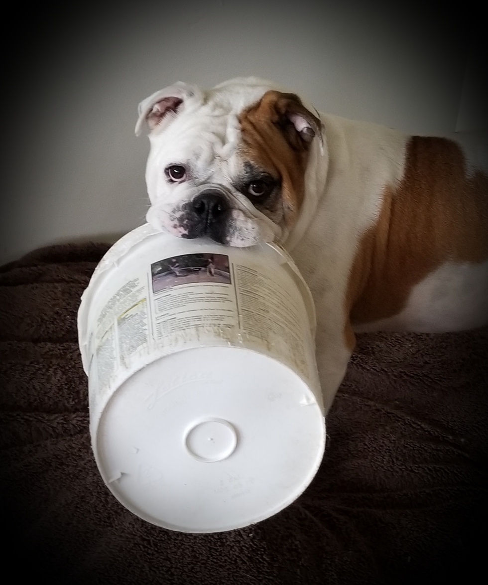 Walter was surrendered as a puppy to a shelter I worked at. He had a severe liver shunt and his breeders didn't want him anymore. I adopted him, and with the help of friends was able to get him the life saving surgery he needed. He still has some liver issues, but overall is a happy and healthy boy. He loves everyone he meets, including children, dogs, and cats. He also loves the beach and barking at his deaf Staffy brother, but his favorite toy has always been a pail. This was one of the few times he wasn't wearing it on his head or tossing it around. It's a loud toy and destined to go through a window or my TV someday, but he has fun. I'm so grateful for every day with him, I spoil him rotten!