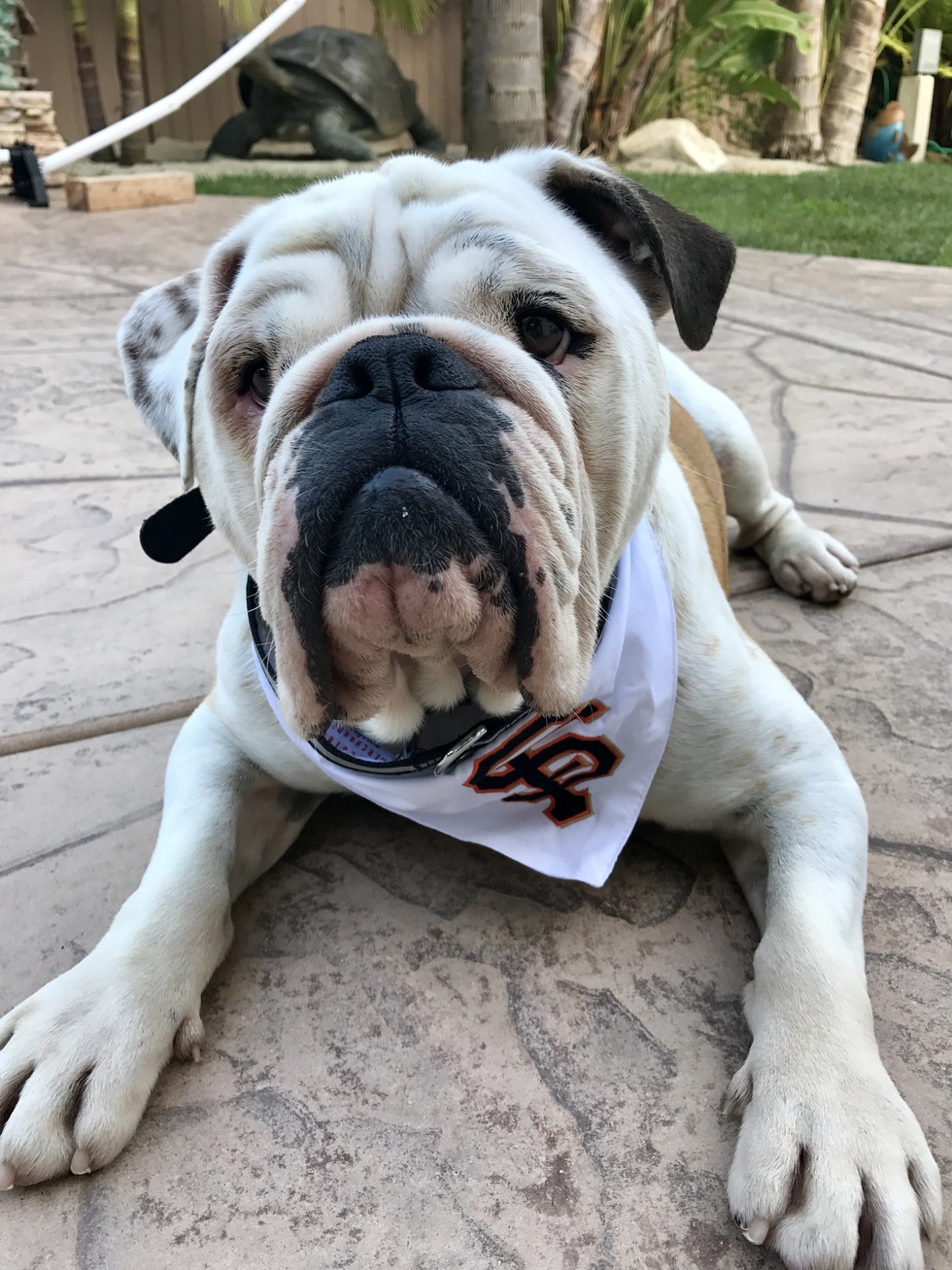 Posey is a 2.5 year old male bulldog named after Giants catcher Buster Posey. He loves doing his daily sprint around the yard, playing football, and going to the beach with his family. Oh yeah, and he will eat just about anything.
