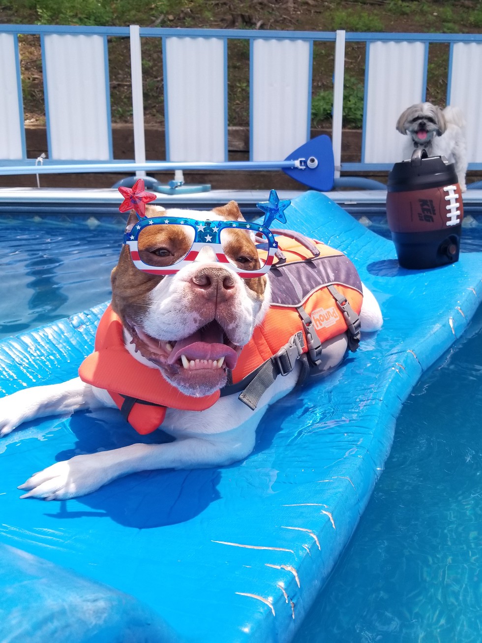 My name is Meatball, I love Tomahawk steaks on the grill, red and YELLOW watermelon. I have my own room with a tv and couch I guess I snore too loud lol !! The Summer time is the best I Float around the pool drinking my puptea from my keg!!