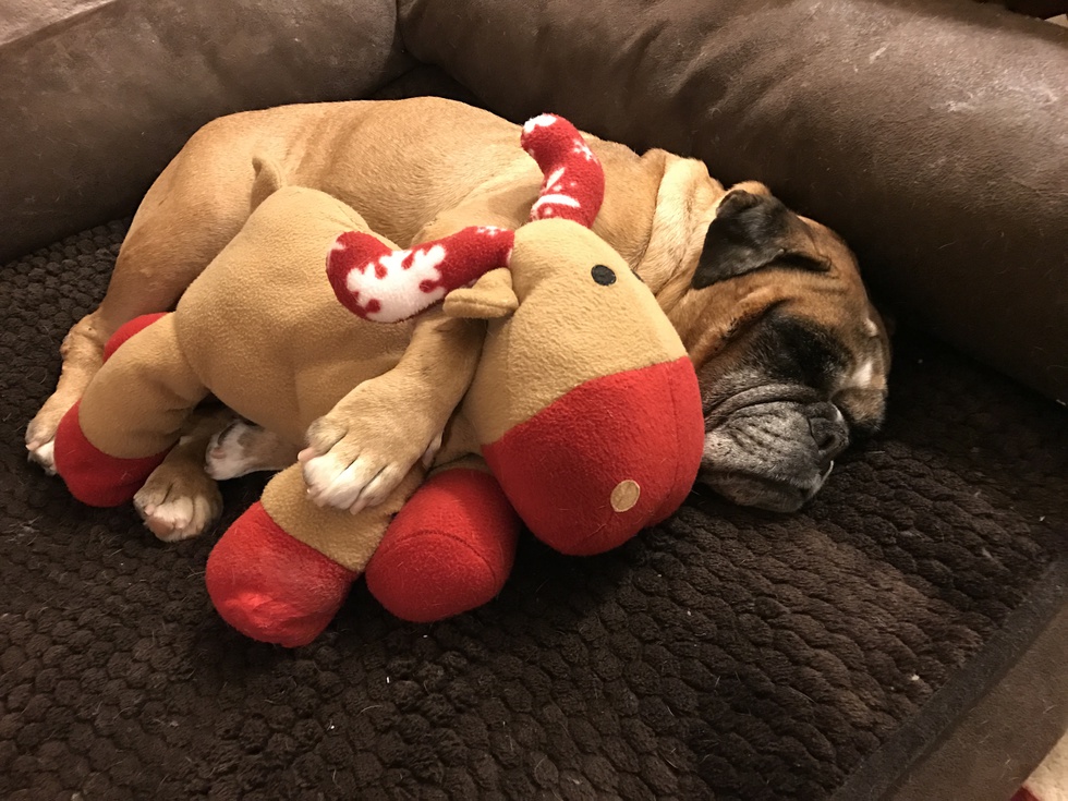 Frannie was a severely neglected and sick stray last year when the shelter referred her to SoCal Bulldog Rescue. We adopted her in November 2016, health issues and all. She is our perfect cuddle girl, in hospice for her battle with metastatic mammary cancer but ever sunny in disposition, quick to give kisses and LOVES soft beds and especially stuffed toys!