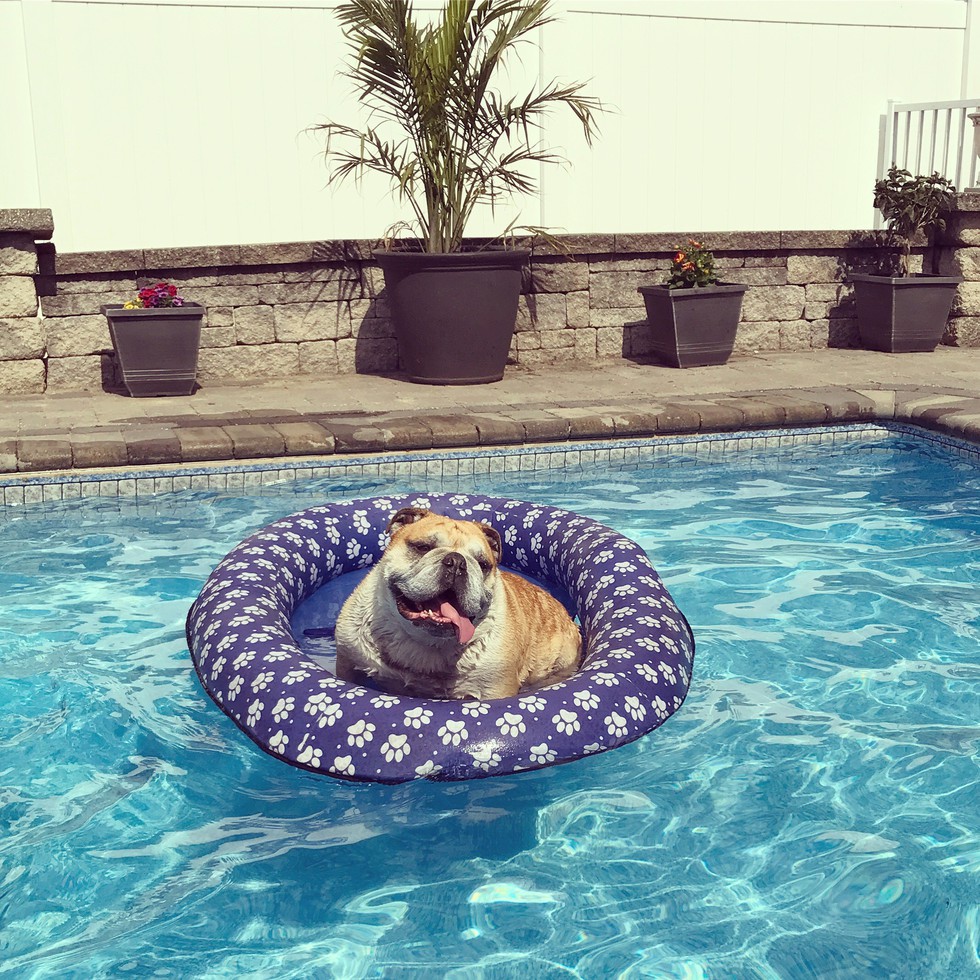 Dozer is our 7.5 year old big baby boy who makes our life better every day in every way. He loves everyone and everything, especially floating around in "his" pool!!! His big smiley face is hoping to raise lots of money to support the amazing work SoCalBulldog rescue does for this amazing breed.