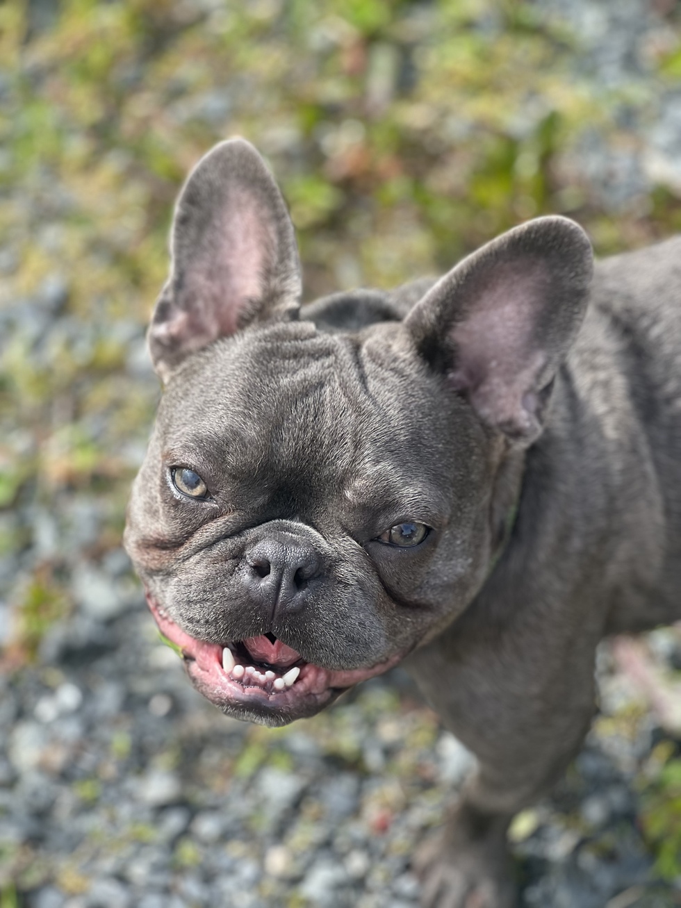 This is Weston, aka West. He is a blue fawn. Rescued by SCFBR and adopted and living his best life in Alaska. This high charged, wrestle mania, crazy man, immediately sparked new life in his new home with his magnetic and charming energy. He loves his toys especially his soccer ball, and has taught the other frenchies how to play fetch. West and his sister Smith still love to wrestle and if he can get everyone to chase him through the backyard then he is one blissed out pup.