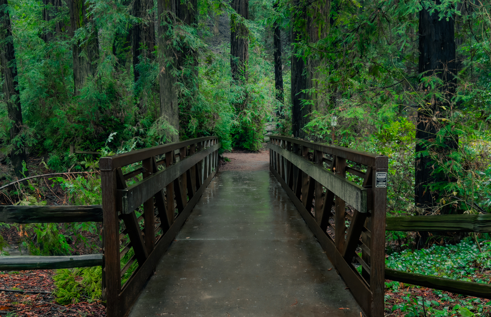 This photo was taken after a winter rain at Riverfront Regional Park near Healdsburg. The wet bridge caught the reflection of the surrounding redwoods, pulling the greens of the forest down onto the path itself. I liked how the bridge naturally draws you forward into the quiet of the grove. On mornings like this the park feels still and peaceful, and the trails invite you to slow down and just walk.