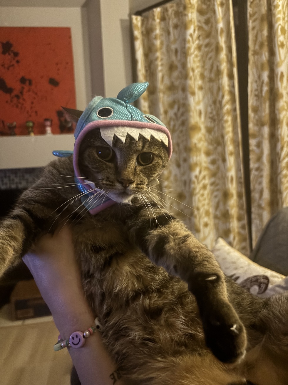 Tiger Lily Ann, brown tabby dsh dressed as a shark. 🦈