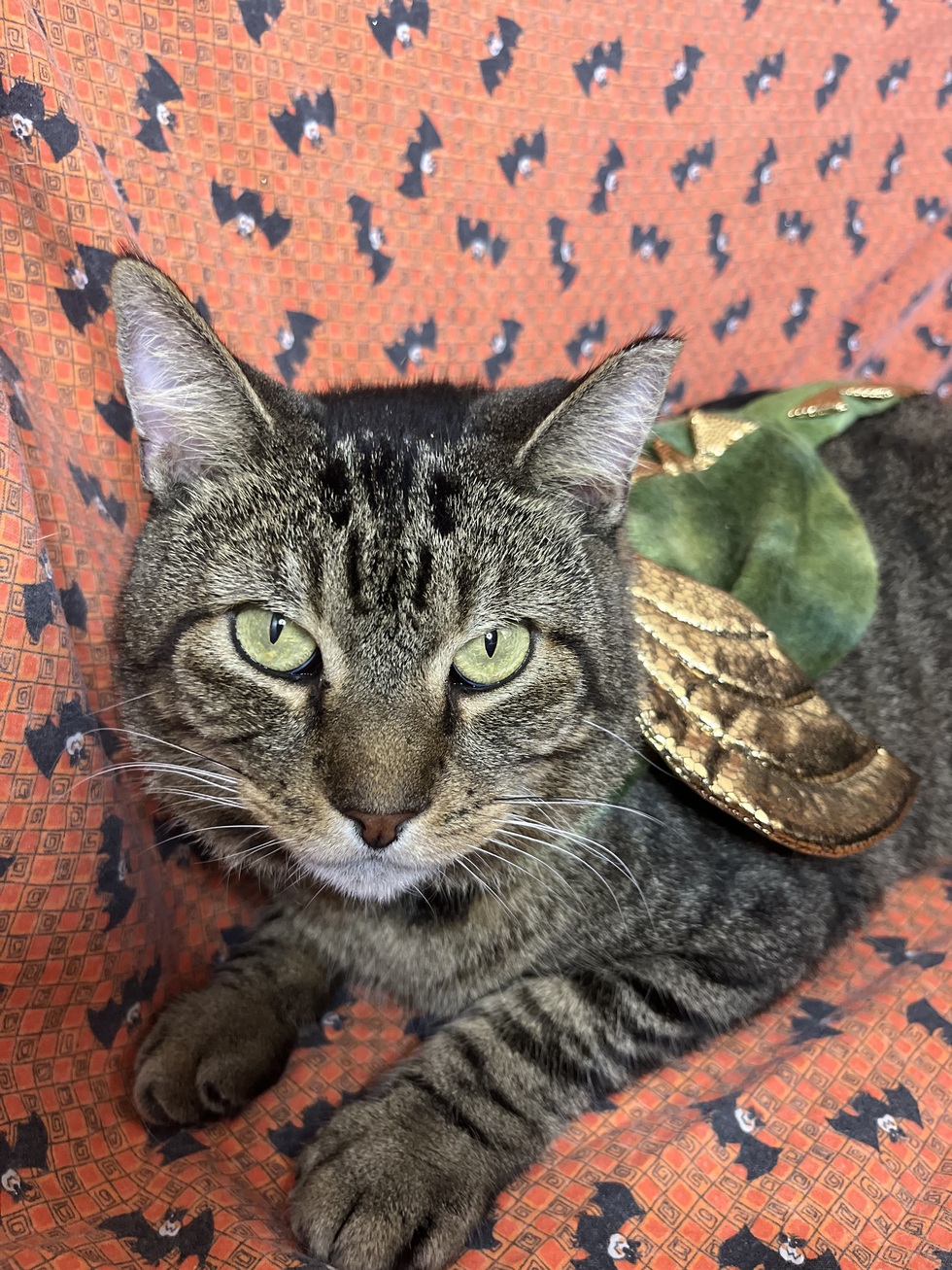 Bilbo was a foster of mine who was on a special diet. As a special-needs boy, it was hard for him to stand out at adoption events in a sea of tiny kittens, so to get help draw attention to him, we dressed him up and he actually loved it! After about a year in foster, he got adopted and is now living his best life with his two human guardians and his two dog siblings.