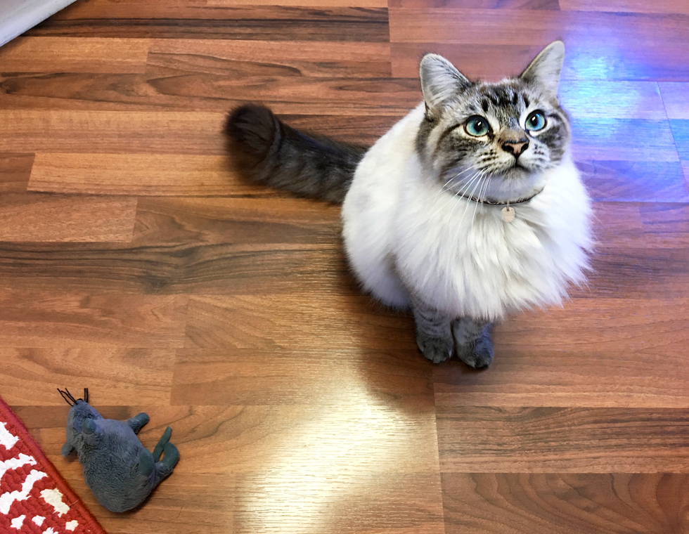 Hi! I'm Luna and on Aug. 23, 2017 I'll be a year old! My mommy and daddy adopted me from the SPCA for Monterey County just after Christmas. So in my new home I got to have fun playing with the tree before it was taken down... Which brings me to my next topic... My most favorite thing to do is play! I have so many toys, and I make sure to play with each one every day! My favorite toy is my mouse which I like to take everywhere, and my frisbee which I play fetch with! And my pink mouse, and oh I forgot to mention little things I find around the house, those are also my favorites! My mommy has a lot of plants and usually puts them where I can't reach (yet), but every chance I get, I play with those too! I also love to make friends and talk! I'm purr-fecting my loud meow, and my favorite time to practice is bedtime :D Maybe my mommy and daddy will adopt a brother or sister for me, so I can meow with them too!! Mommy says if I win this contest, they'll think about it, so pleeeeaaassssee vote for me!