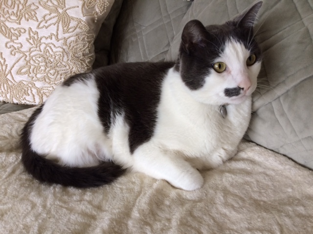 Surrendered by his owners at six years of age, Cedric now lives in Carmel Valley with Caleb, his golden retriever brother, delightedly spending his days safely indoors watching the native birds visiting the birdbath and feeders.