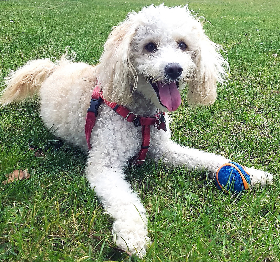 Bajo (bah-ho) was adopted in Loreto MX, where I was on a whale watching trip. The vet there said he was ~ 9 weeks of age at the time of his rescue after a car hit him. Bajo dislikes the heat, and is living una buena vida now (except for that one gnarly raccoon attack)! He loves the beach, hiking, playing catch, little kids, and rolling in grass (and together, we get the inevitable "nubblies" out of his poodle fur!). According to the pet DNA results, he is a mix of poodle and rat terrier--a "toodle." His smarts, liveliness, and devotion bear that out.