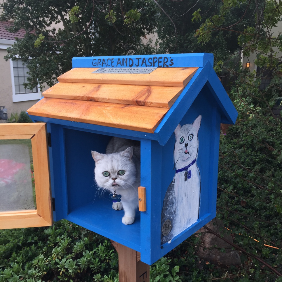 Jasper my cat and Grace my Golden are the hosts for my Free Library in Marina. This photo shows Jasper checking out the library before the books were placed inside. His fun likeness is painted on the right side of the box and represents his personality. Everyone loves Jasper and anytime his mom posts his photo to Facebook he gets lots of likes!