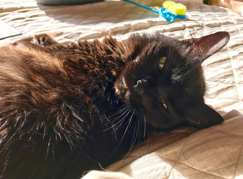 It was on a bicycle ride through that park with a friend (himself a former mayor of San Antonio) that I first noticed a large black cat living at an abandoned auto dealer’s lot on the park’s edge. The mayor then alerted me to the large number of abandoned animals living within the park’s boundaries. Over the next few weeks I continued my bike rides to the park, now armed with canned cat food for the black cat. We became friends and eventually I took him to the vet to check him out. The diagnosis wasn’t good, living off the land had not been kind to him. He could not go back to the park, was not adoptable in his condition, so he became ours.