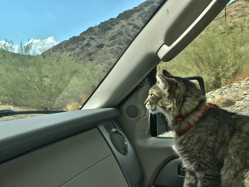Tut is a true Maine Coon by personality and loves the adventure of the drive out from Texas. When we prepare for the trip out we can count on Tut self-installing himself in his carrier the night before, we believe to insure he’s not forgotten. He rides in my wife’s lap with a halter and leash and loves to watch the scenery go by, he is particularly fond of large trucks. When we hit Salinas he somehow knows we are approaching Carmel and puts his nose in the AC duct to confirm our position. He becomes very excited and always rewards us with a very dynamic tail wagging session until we arrive at the house!