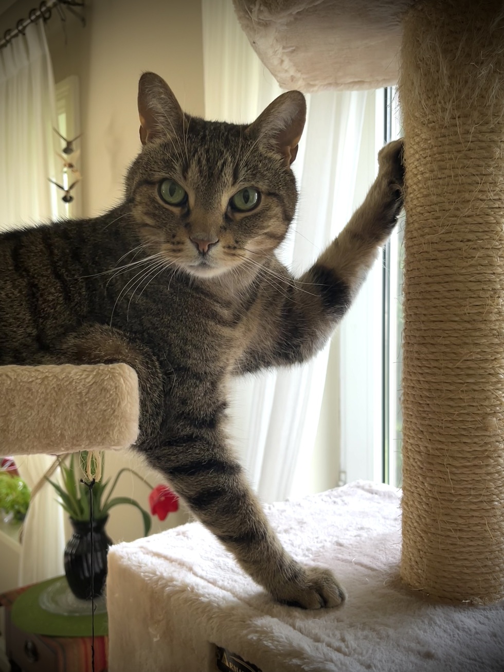 À mon arrivé dans ma nouvelle maison j’étais en surpoids et j’avais de la difficulté à me déplacer….alors avec une bonne alimentation et l’aide de mon humain j’ai perdu le poids nécessaire qui me permet aujourd’hui de courir, sauter et faire mes exercices entre chaque siestes!!!😻