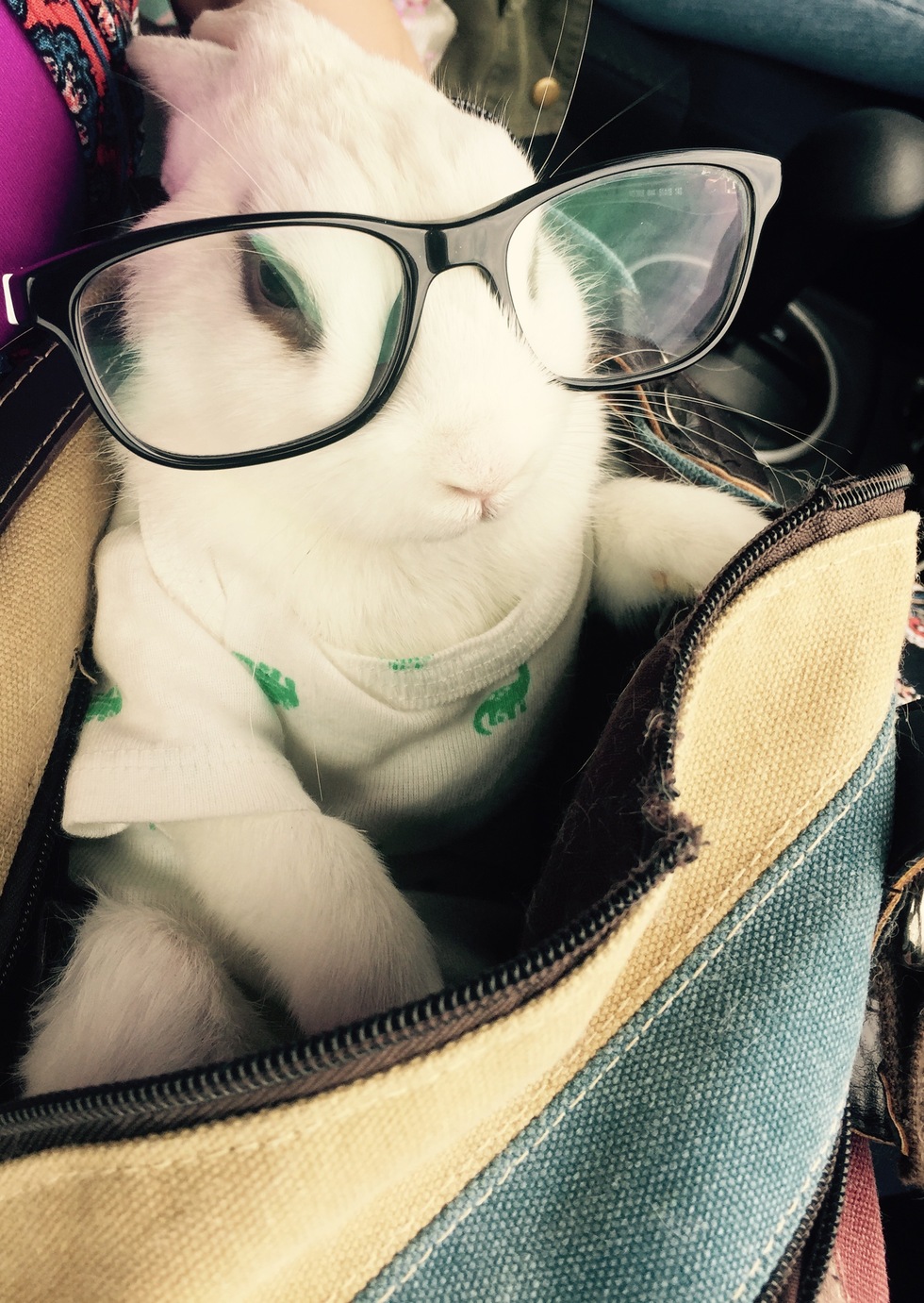 Mo is a dwarf Blanc de Hotot bunny with the calmest personality. He loves being held and cuddled, enjoys going outside, and never says no to kale.