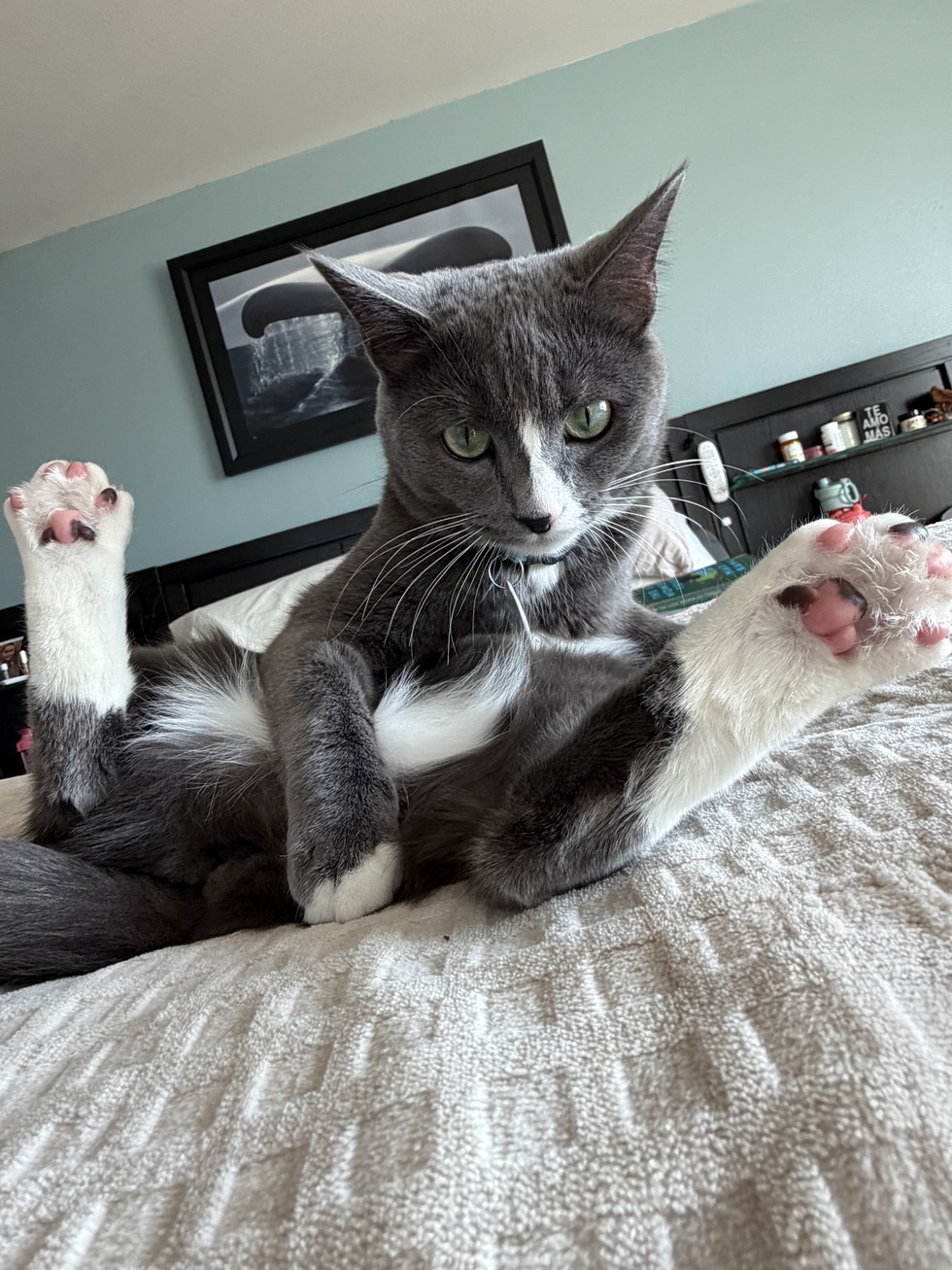 Tinkerbell, is a grey and white tuxedo crusader.