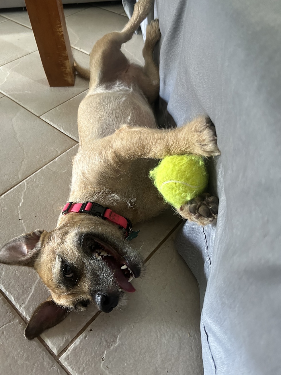 Tally was found in a bucket at the dump with her sisters. This bearded lady has turned into a ball obsessed psycho mongoose who rules the house!