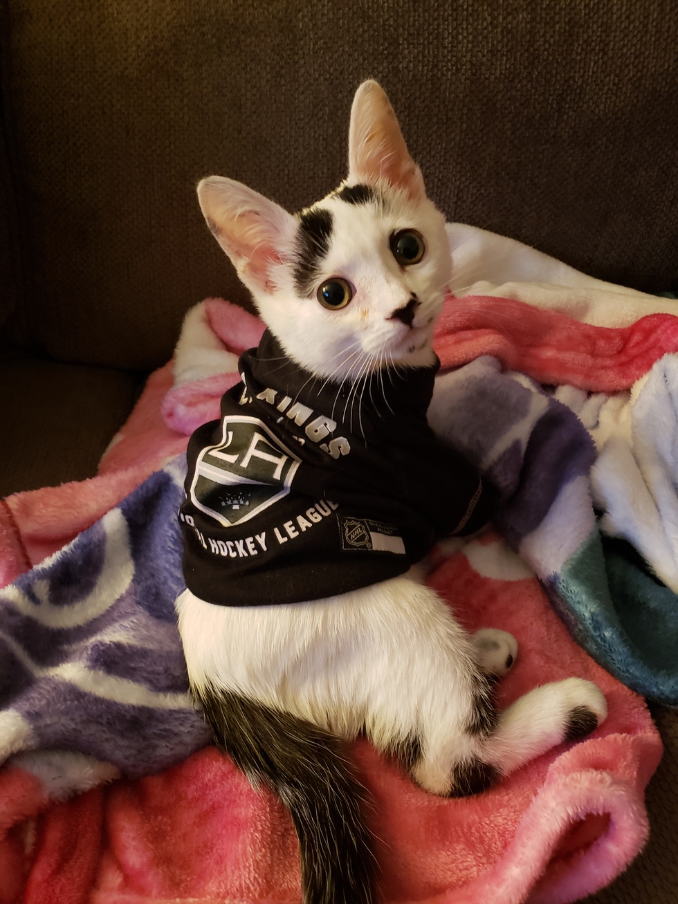 Hello my name is Nike. I was born with low born density which makes it difficult for me to jump and climb. But I don't let it slow me down. Thanks to all my custom ramps, I can move with ease throughout my home! On hockey nights, I wear my LA Kings jersey and cuddle with my mom as we cheer the Kings to victory! Mom says I'm the cutest thing ever to wear a jersey.