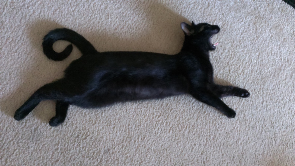 Riesling is my name, because I'm so sweet, like the wine. I came from my city's animal shelter, and I was there for 2 months! Being a black cat, for some reason it takes longer to get adopted, but my hooman specifically asked for the ones there the longest. I am patient with my sister rescue, who came to us after living near a dumpster all alone. I accommodate her shenanigans, even though I'm naturally a pretty chill creature. I slow-blink to show my affection, and am always appreciative for my yummy natural-ingredient meals, complete with spring water. I show up for breakfast and dinner early. I greet lizards and birds with chirping while watching Cat TV, aka the window. I love my brushing sessions, too.