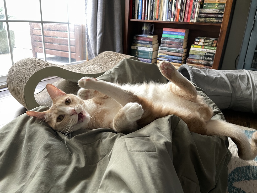 At 19 pounds, I’ve never had a meal I didn’t like. I answer to Gordo just as often as my actual name. I was adopted with my sister and I love annoying her and kicking her out of comfy spots. I love my humans even though they need gentle nips to the ankles to speed up the feeding process.