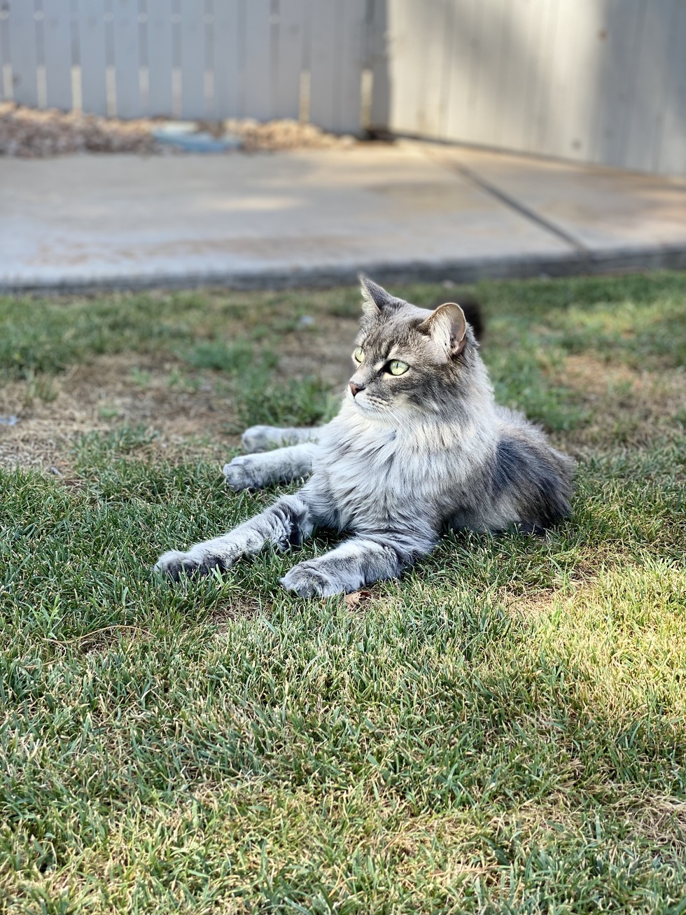 Desert Paws Rescue rescued Pretty Lady. These are cats given before being euthanized. I don't know the exact history before her rescue but her willingness to trust and be open to the hands of hoomans really held on to my heart. I knew she was mine the second I pet her. Taking her to the vet as an adult 3-year-old cat, she was under 5lbs, an ear infection in each ear and infected with ringworm which she eventually gave to her hooman. After 2 months of grueling, towel burrito cat twice daily medications and she BLOSSOMED. She has become a very vocal, bird-hunting, sweet cat that my neighbors learned to love, and I've had the pleasure of taking care of for the last 3 years.