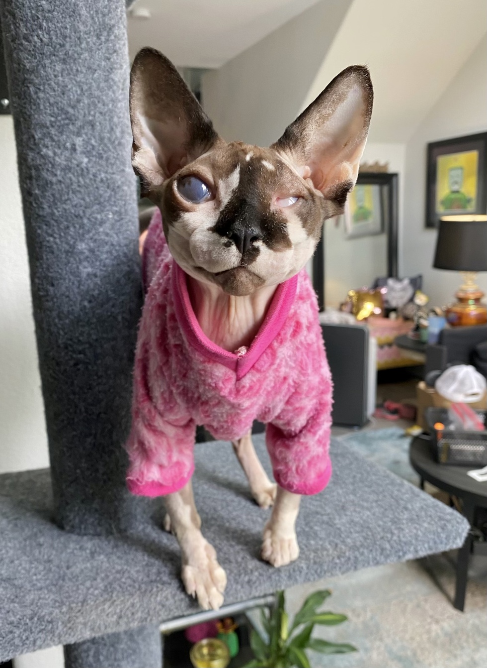 I was a very sick little kitten when I was dumped at a kill shelter in Tacoma. I had an ear infection, eye infection, sinus infection and respiratory infection. As a result, one of my eyes was destroyed and the other was permanently damaged. My sinus cavity was also irreparably damaged. My forever person, who lives in Los Angeles, heard about me from a nice lady who rescues hairless kitties. The lady said I was one of the most sick kitties she had ever rescued. She even thought I might go to the rainbow bridge! But I was resilient and I wanted to live! I knew I had a purpose. When my person saw my pictures and heard my story, she knew we were meant to be. She believes that her other hairless kitty who passed over just one month earlier had helped guide us to each other. Sometimes I think I can see her Angel spirit. So it really was a match made in Heaven!! My person took me on an airplane back to Los Angeles, where I am now living my best life! I purr a lot and I love to snuggle on my person’s shoulder. She takes me on walks and sometimes I even go to the office with her! I have a fabulous wardrobe too! My person tells me how much she loves me all the time. She said that I have saved her life and that I help her with anxiety. That’s why I was named Grace. And I think we rescued each other. Don’t you agree? ❤️
