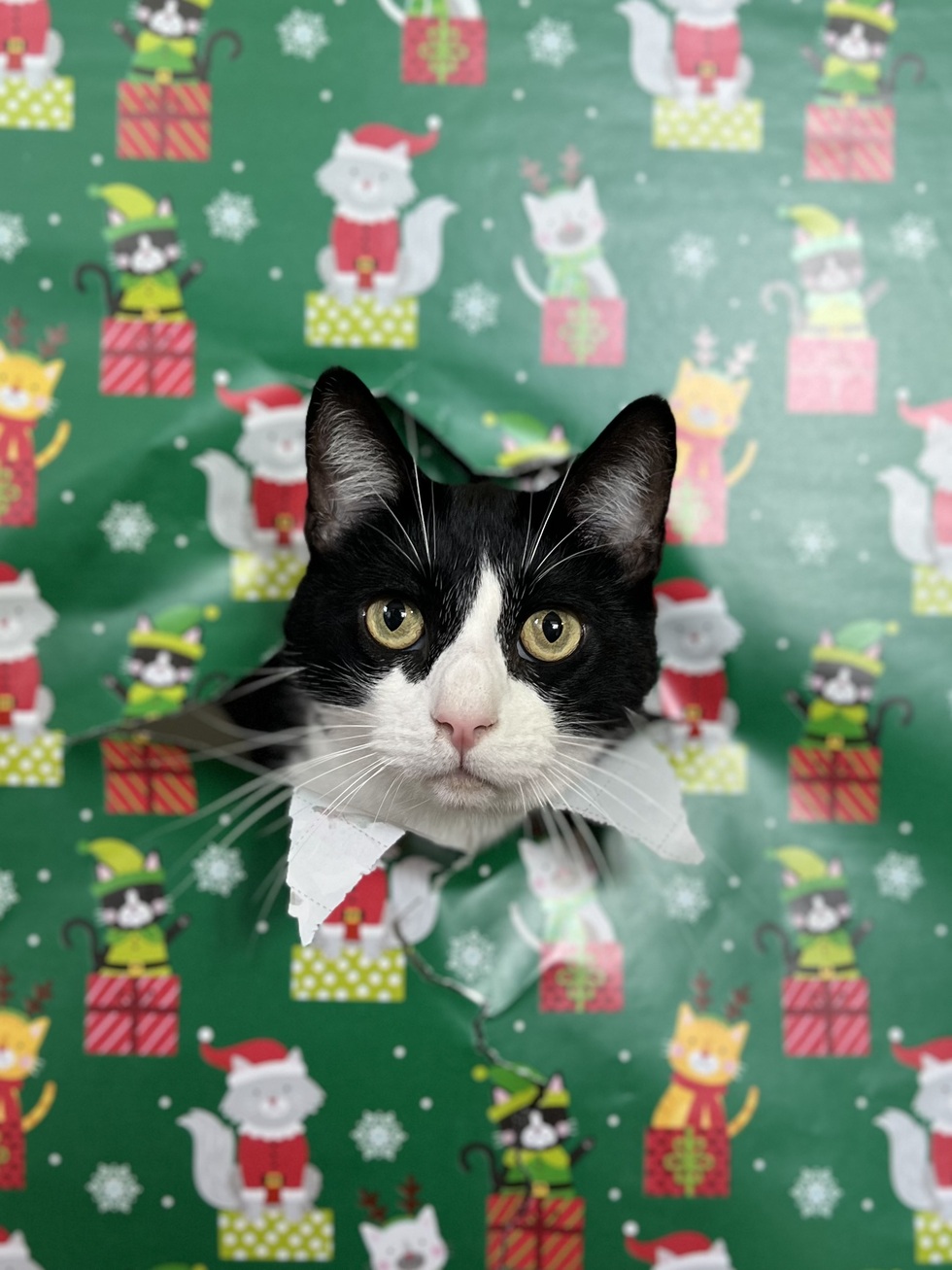 Comet is a tuxedo chaos gremlin with a snack addiction and a lot to say. He’s bashful but spoiled, not into cuddles, and shows affection by placing one paw on his humans.