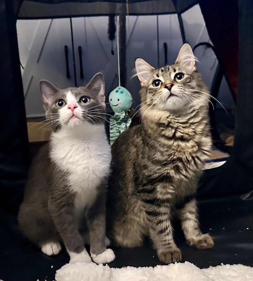 My brother was feeding a stray cat and it went from 1 to 14, he trapped them all & brought them to stray cat blues. These kitties were living on my father in laws property so we decided to adopt two of them, and named them after my brother Dino Montgomery Rosie who passed away and always loved cats. We applied and then were in touch with the foster mom Donna and kept in touch with her until we could take them home. Now they will have a new life with us, no longer living under rocks or hiding from foxes, they will be spoiled boys with toys and treats and lots of love!