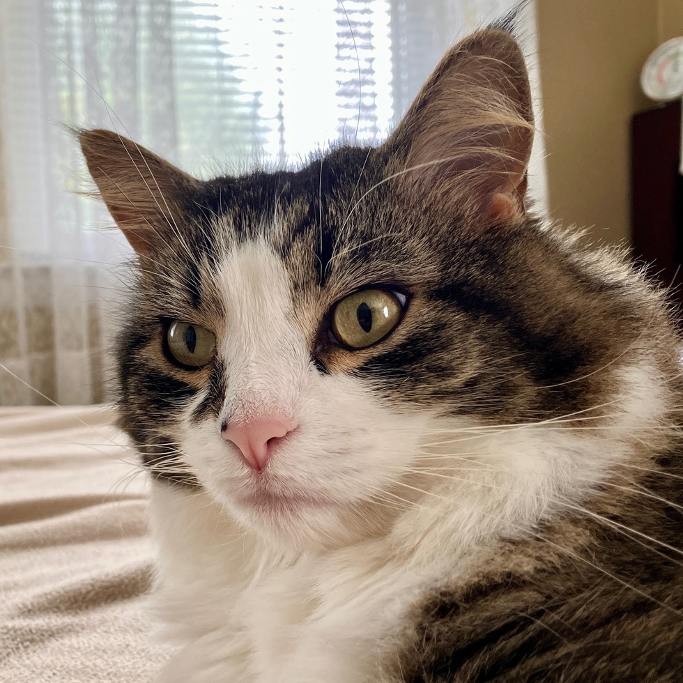 We adopted Hannah in 2021. Our elderly cat had recently passed away, but we were thinking about adopting another rescue kitty. Hannah was sitting in her PetSmart cage looking so nervous and hopeful, and we couldn't leave her there! She is now our work-from-home supervisor and resident bird watcher. She loves to be wherever we are. She's extremely smart and chatty, and she will carry her toys in her mouth and drop them in front of you when she wants to play. We are so lucky to have her in our lives!