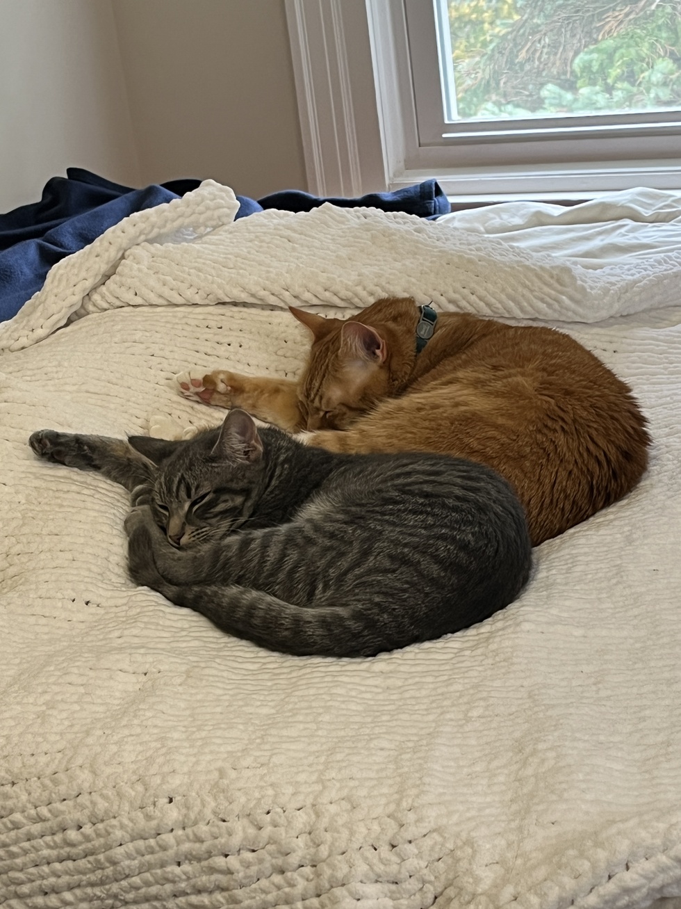 Quinn was a tiny spark of energy when she first came home, curious about everything but unsure where she belonged. Her big brother, Benji, watched from a careful distance—gentle, patient, and a little cautious. Day by day, he let her get closer: a shared toy here, a nap nearby there. Then one afternoon, they curled up together for the first time, matching each other’s pose as if it had always been that way. Now, Quinn and Benji are inseparable—best friends and true synchronized sleepers, often found side by side in perfect harmony, even in their dreams.