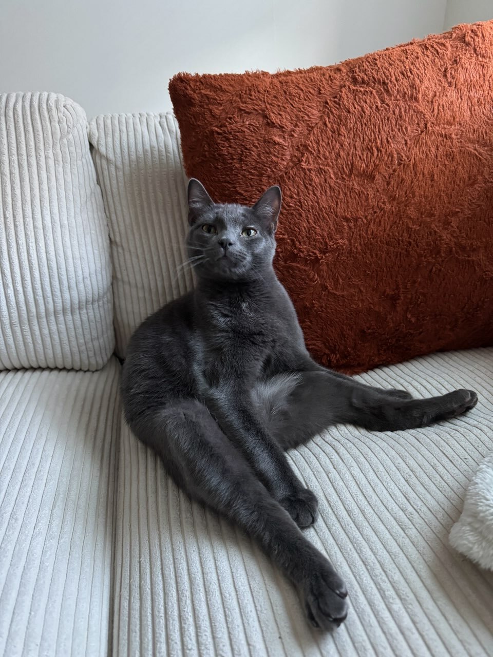 We adopted Goose (formerly named Mack) from Stray Cat Blues in 2023 after seeing him posted on Instagram. Goose is the first of three tailless cats that we've adopted, another being his brother Duck, who is also from Stray Cat Blues. Goose loves napping on his window hammock, chasing his brother around, getting the zoomies, and biting your ankles when he wants attention.