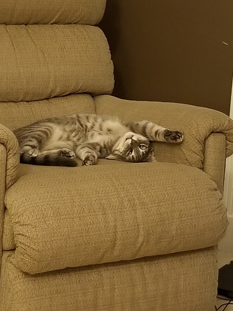 We adopted one fur baby in Nov. 2020. I felt he needed a sibling. When I saw Mable, even though she was a bit older and an outdoor cat most of her life, I knew I wanted her. She has accepted her brother, but the human side of the family has been a different story. She is a work in progress. This picture was the beginning of acceptance of her human family.