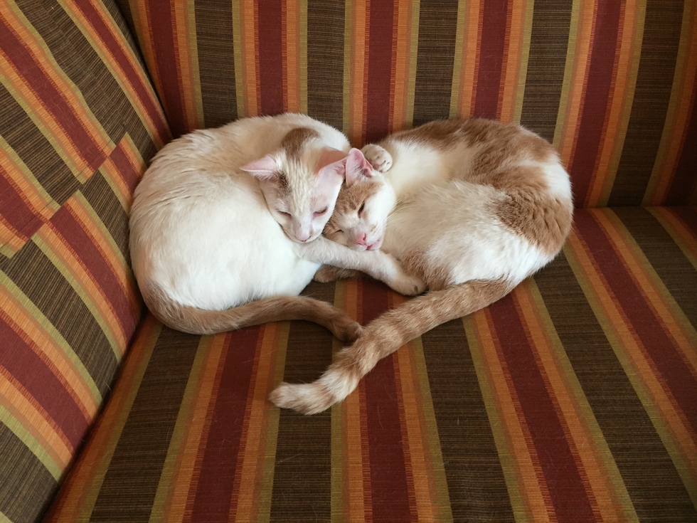 Mel(R) and Dean (L) came to me from ACCT as very sick kittens. I fosters them and nursed them back to health. They got me through the loss of my mother and my husband’s serious illness. They are foster failures and I am grateful for them every day! Mel survived a bout of FATE last year, walks a little wobbly, but is a happy living boy enjoying life! Dean joins us for dinner every night and loves all vegetables. They share their home with 2 dogs, another cat (foster mama from stray cat blues that also stayed) There is often a mama and babies residing here too! We love our sweet boys!