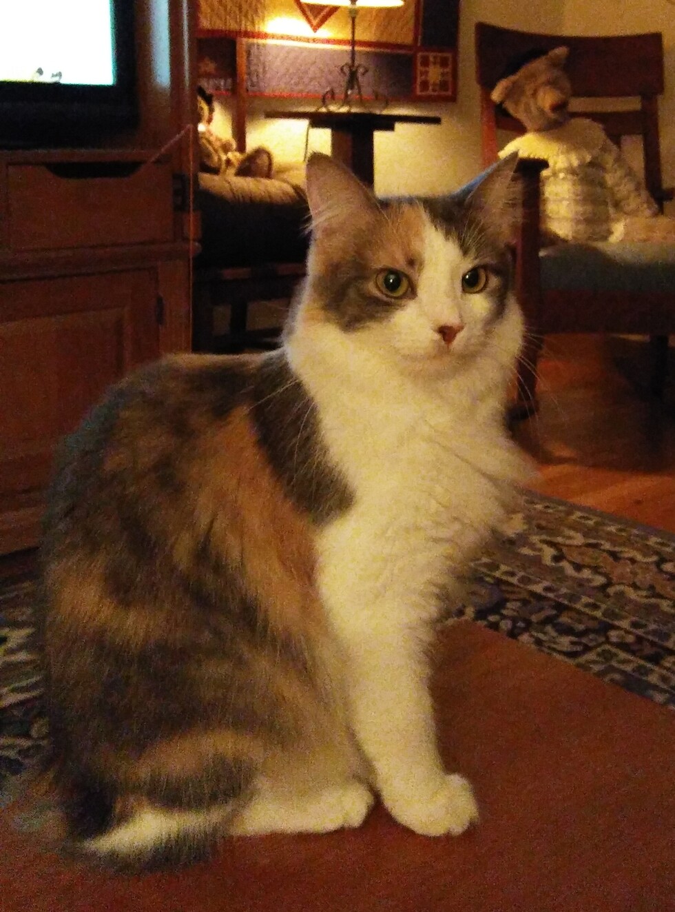 Jessie is a DMH dilute calico feral kitten that was caught with her siblings. She was spayed and fostered by Melissa Murphy and felt to have such a sweet personality; so she was put up for adoption. I was the lucky one to adopt her, and she's been a joy in my life ever since! She still doesn't meow, just squeaks. It's so endearing:)