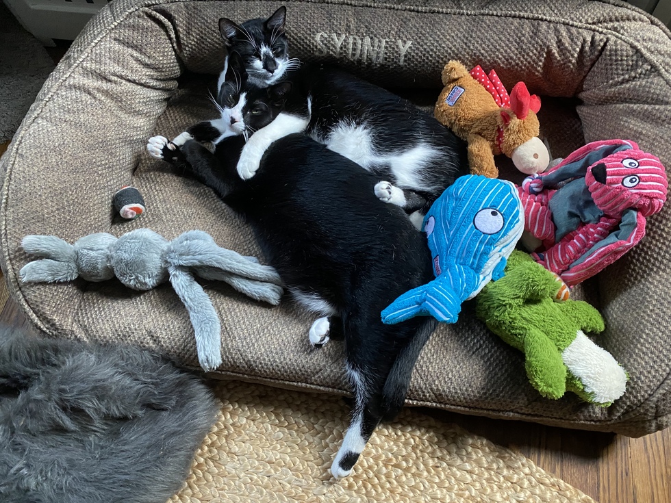 We adopted Kimchi and Sake when our beloved 14-year old tuxedo cat named Sushi died of lymphoma. We could not think of a better way to honor Sushi than by rescuing another kitty and we ended up with two! Kimchi loves to eat his kibble and take naps. Sake loves playing with springs and wand toys. Kimchi and Sake bring so much joy to our family!