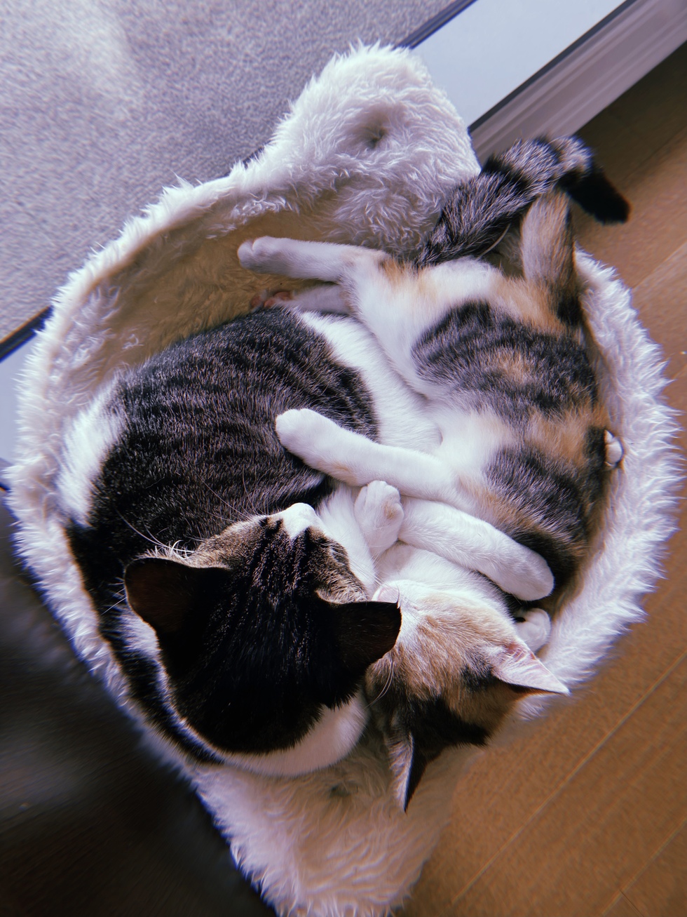 Azula and Georgie were both taken in by SCB and were nurtured back to health by one of the amazing fosters at the rescue. Though Azula only has one eye, Georgie is always glued to her side and acts like Azulas second (and third!) eye. When these two aren’t competing to see who has the fastest zoomies, you can find them in a cuddle puddle like this - completely inseparable! Thank you Stray Cat Blues and Aimee Davis for our two happy and healthy family members!