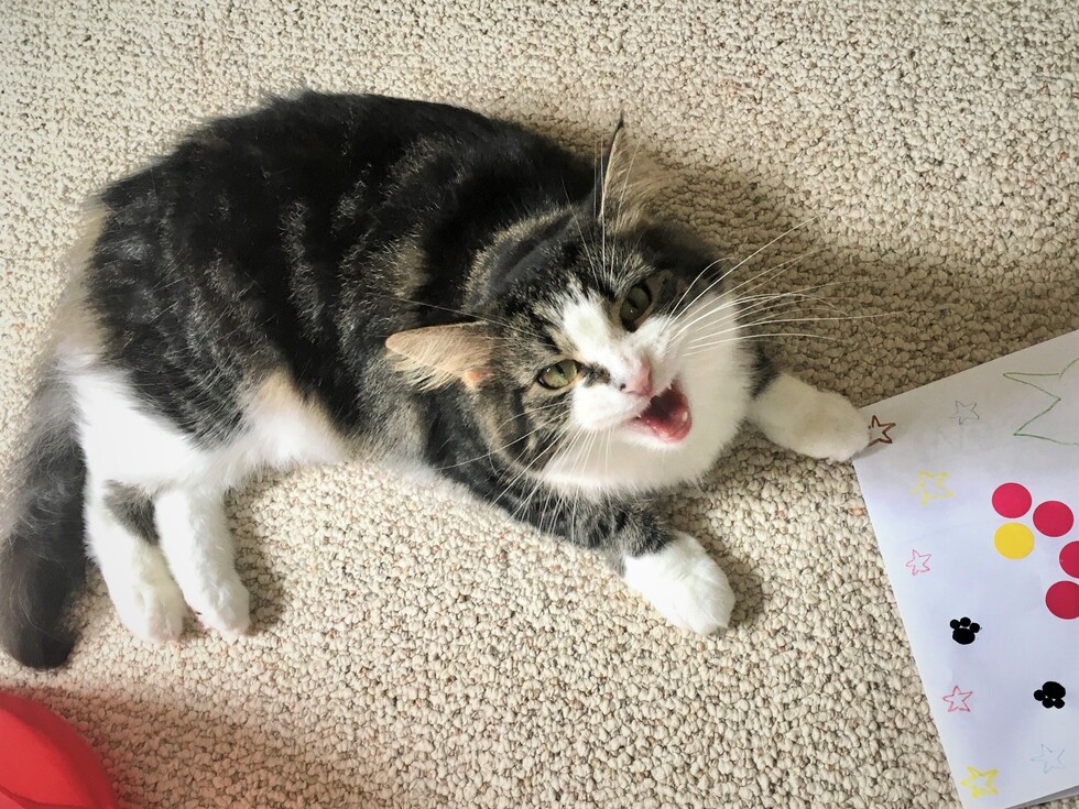 Our 16-year-old cat passed away last fall, and we intended to honor her memory by adopting a cat from a rescue sometime in 2021. We weren't expecting to do so over Memorial Day weekend, but Hannah's description on her cage in Petsmart made us reconsider. Quiet home? No dogs? 1-2 owners? That's us! Hannah has settled in wonderfully and she is such a joy! She is very gentle and enjoys lounging on all the windowsills, but she can be a goofball, too. She loves playing in paper bags, and most mornings we wake up to find that she brought her favorite toys to the foot of the bed. In this photo, she was thrilled to have received a card from her human cousin, who gets along with her very well and also loves her as much as we do! Thank you for bringing Hannah into our lives!